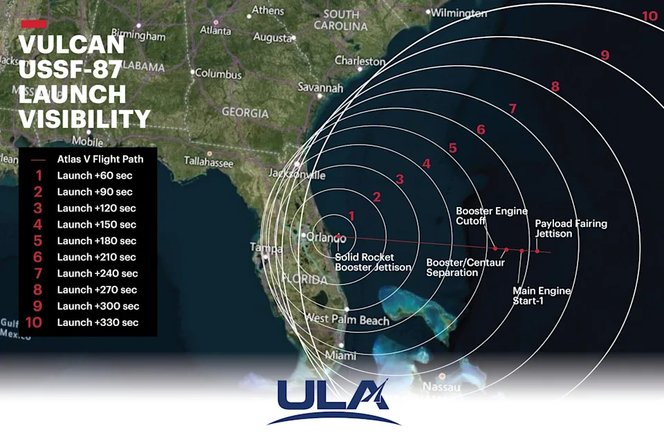 Согласно графикам, предоставленным ULA, в зоне видимости запуска окажутся следующие районы: Космическое побережье, Округ Индиан-Ривер, города Нью-Смирна-Бич и Дэйтона-Бич, а также западные части Флориды и даже Багамские острова. Жители и туристы, находящиеся в зоне видимости, смогут наблюдать за запуском в разные промежутки времени после старта, что делает данный процесс еще более увлекательным.
